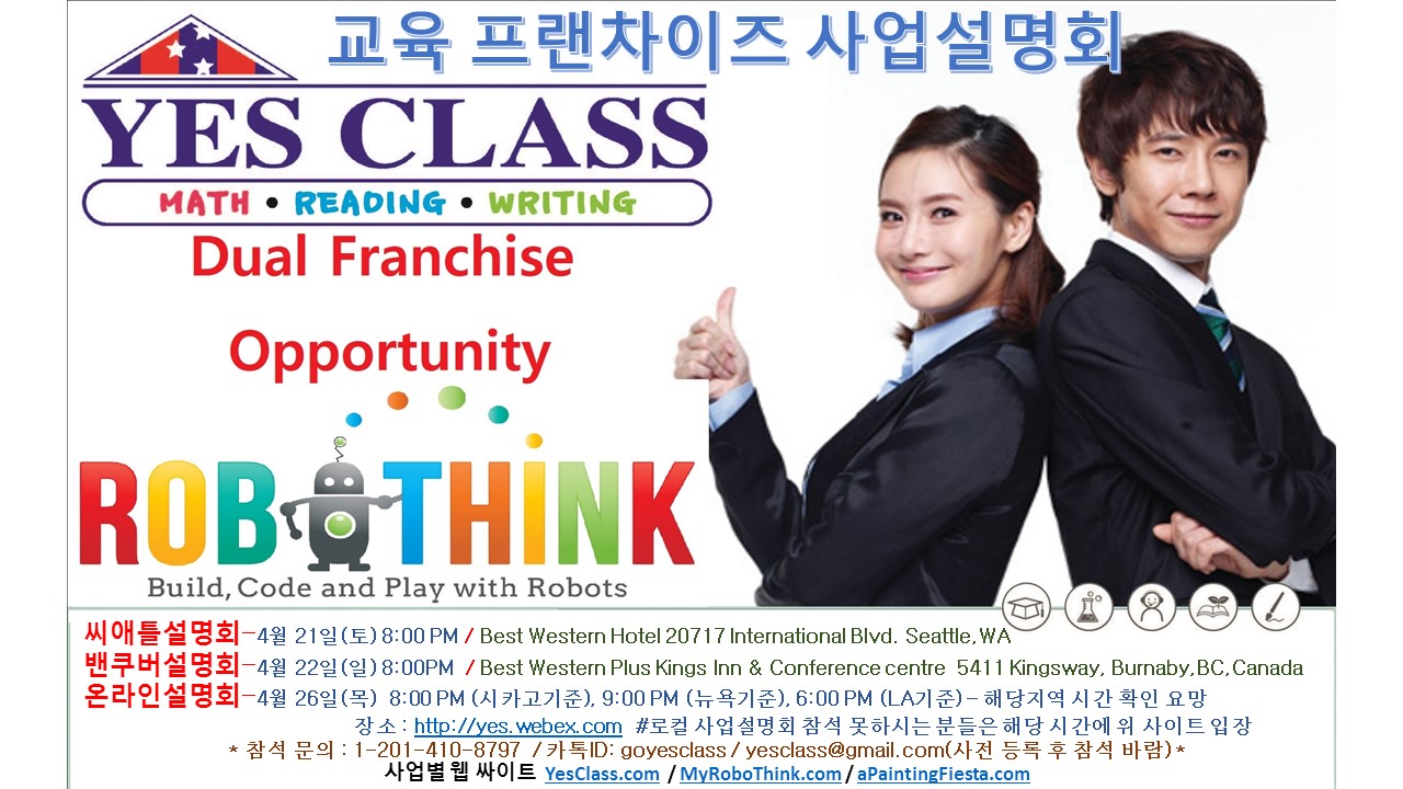 YES CLASS(MATH & ENG)  & RoboThink(로봇 코딩 교육) & A Painting Fiesta (미술 교육) 3가지 교육 사업 기회
